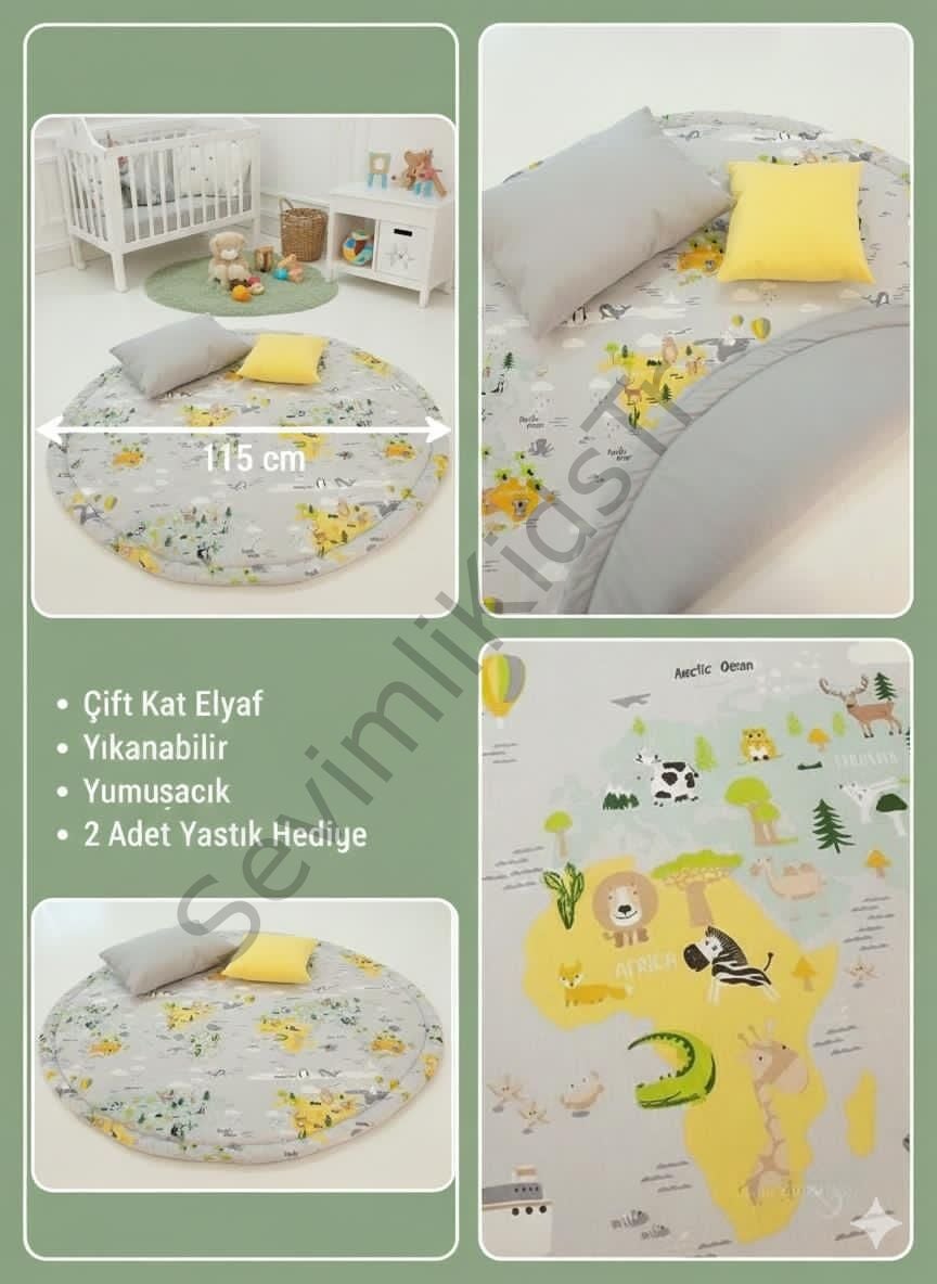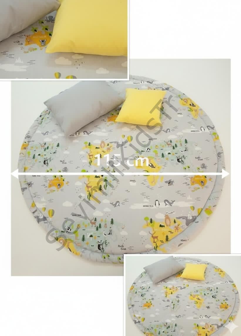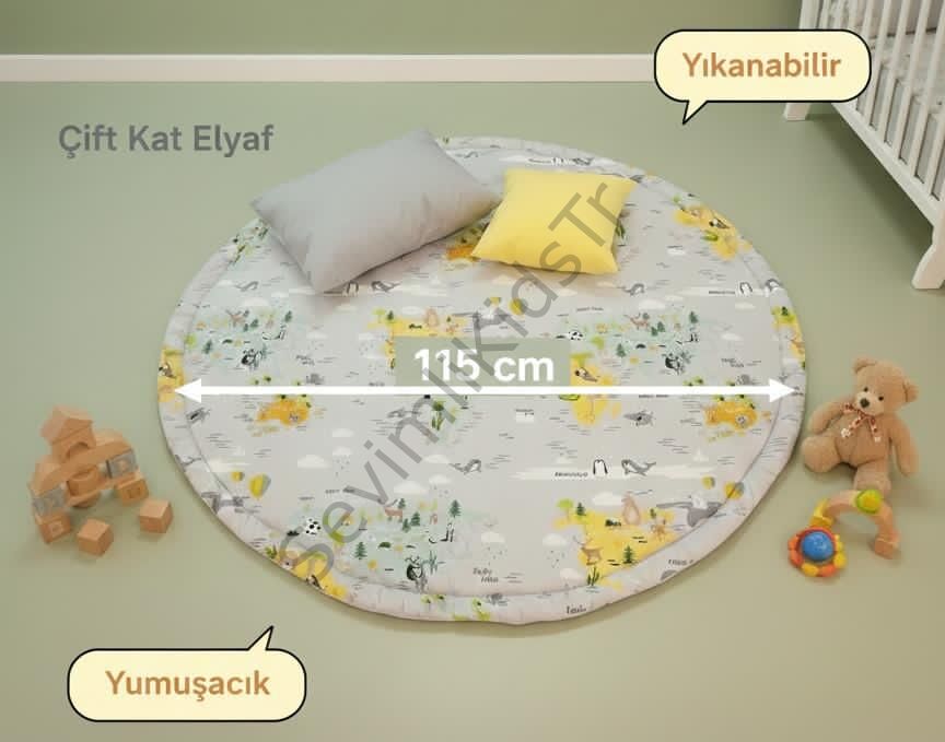 115 cm çapında yuvarlak oyun minderi, bebek ve çocuklar için güvenli, konforlu ve geniş bir oyun alanı sunar. Çift kat elyaf dolgusu sayesinde zeminden gelen sertliği azaltır ve oyun sırasında ekstra yumuşaklık sağlar. Emekleme, yuvarlanma ve serbest oyun aktiviteleri için ideal bir oyun matıdır.